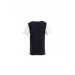Navy blue single jersey knit t-shirt, print on front, crew neck, short white sleeves, white rib knit binding at neck