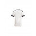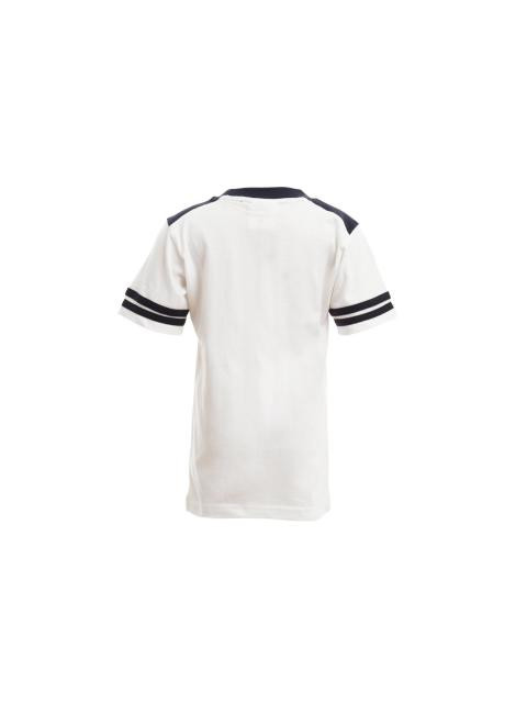 White single jersey knit t-shirt, print on front, crew neck, short sleeves with white navy blue taping, navy blue panel at shoulder, navy blue rib knit binding at neck