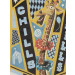 Yellow single jersey knit t-shirt, print on front, crew neck, short navy blue raglan sleeves, navy blue rib knit binding at neck