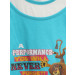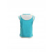Blue coloured single jersey knit t-shirt, print on front, round neck, sleeveless, mock spaghetti styling, blue taping at neck and armhole, straight hem
