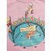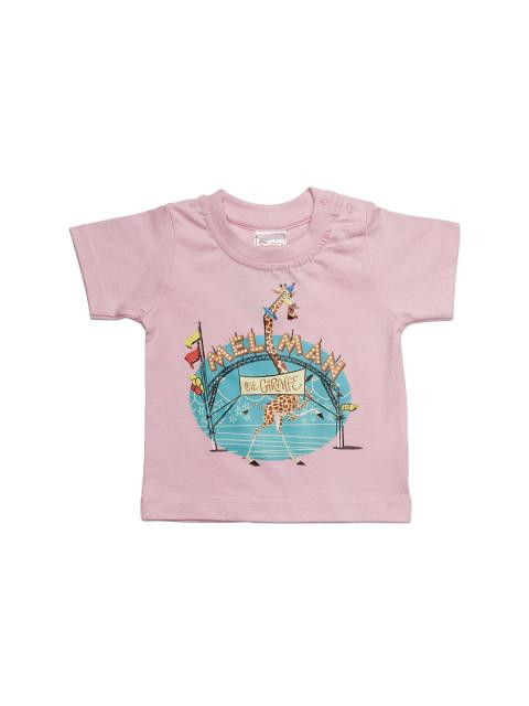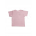 Pink T-shirt with short sleeves, has a round neckline, graphic print in front and press buttons over the left shoulder