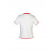 White v-neck t-shirt, has short sleeves with snipped edges, graphic print and applique on the front, stitch detailing, brand tag on the left hem and snipped edges at the hem
