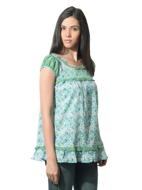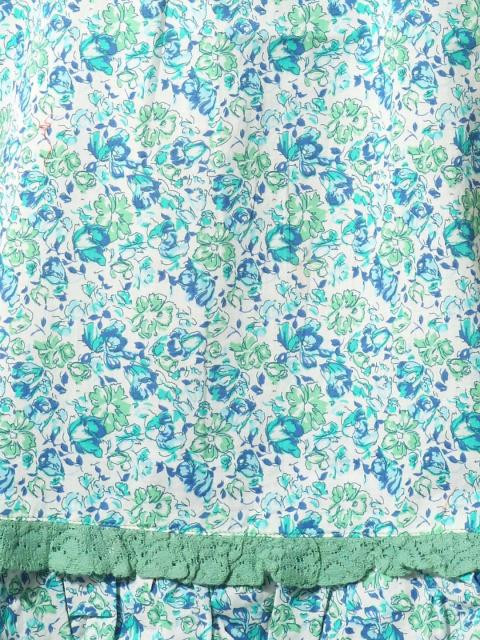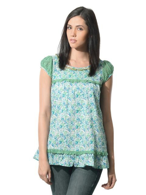 Asparagus green colour floral printed top, has a wide round neck, lace puffed sleevs and lace detailing across the chest and a ruffled hem