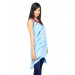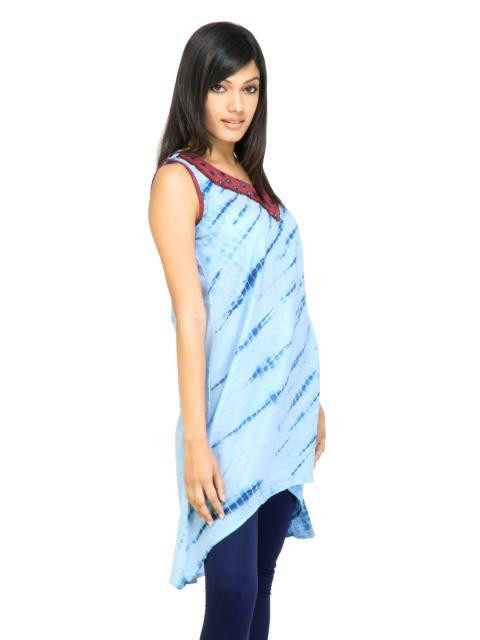 Blue sleeveless kurti made of 100% cotton, has a V-neckline with mirror work on a brown panel, and an asymmetrical cut