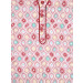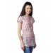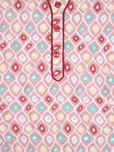 Peach printed short kurti with colourful patterns, has short sleeves with decorative stitching, V neckline, a half buttoned placket, collars with rounded tips, curved hemline with elastication at the sides of the hip for better Fit