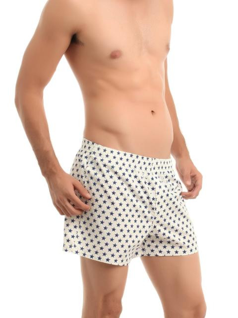 White and blue star printed boxers, has a soft elasticated waistband and a key hole fly