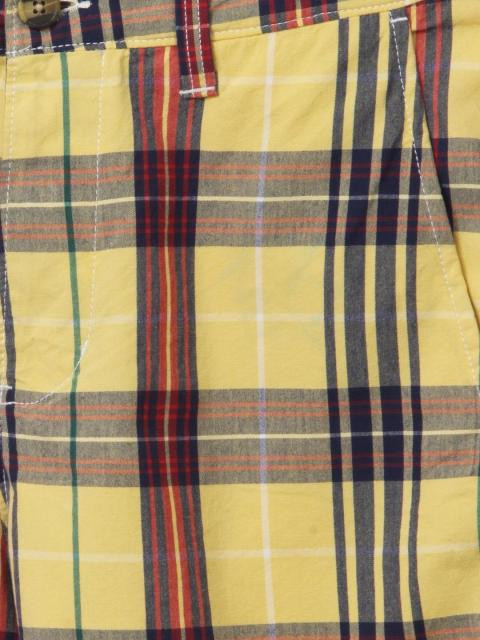 Yellow check shorts, has belt loops around the waist, buttoned closure at the waist with a buttoned fly, two insert pockets on the sides in front and two welt pockets at the back