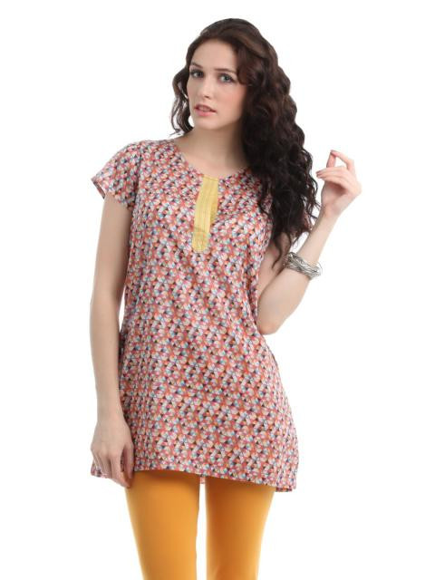 Add a pop of colour to your Summer wear wardrobe with this kurti from myntra. Featuring a colourful, all over geometric print and made from pure cotton this piece scores high on style as well as comfort. Accessorise it with beaded bracelets and strappy wedge heels for an effortless yet inspired look.