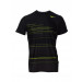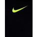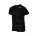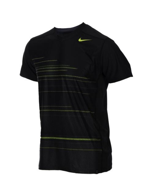 Black V-neck t-shirt with short sleeves, made of 88% polyester and 12% spandex, graphic print on the front, mesh panel at the back of the neck, nike Swoosh printed on the left chest, brand tab appliqued at the hem, and engineered with Dri-Fit technology