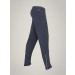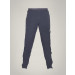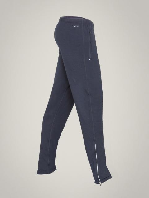 Full length navy blue track pants made of 92% polyester and 8% spandex, engineered with Dri-Fit technology, has handy side zipper pockets with synthetic net lining, small inner pocket, comfortable elastic waistband with inner draw string, zipper at leg ends and logo printed on the left