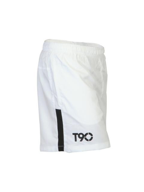 Black shorts for men made of 100% polyester, wide elasticated waistband with drawstrings, swoosh on the left leg, T90 appliquéd on the right leg, panel detailing above the hem on the sides and two zipped pockets on the sides