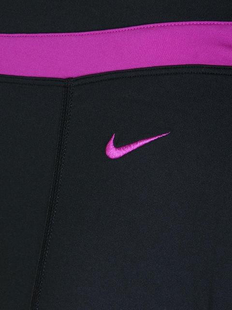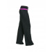 Black trackpants, purple panel on the elastic waistband , nike swoosh on left hip, snug fit at the waist, slight flare below the knees