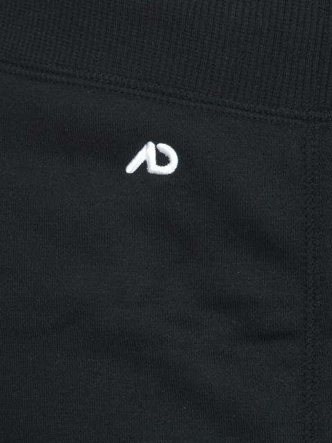 Black track pants made of 80% cotton and 20% polyester, has a broad elasticated waistband with a drawstring, and embroidered branding below the waistband on the left and at the back on the right