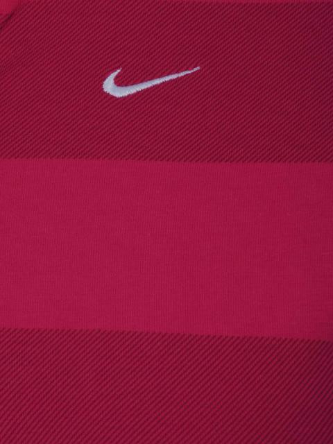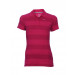 Pink and grey striped polo t-shirt made of 95% cotton and 5% spandex, has ribbed collar and cuffs, and a two-button placket