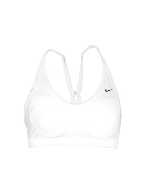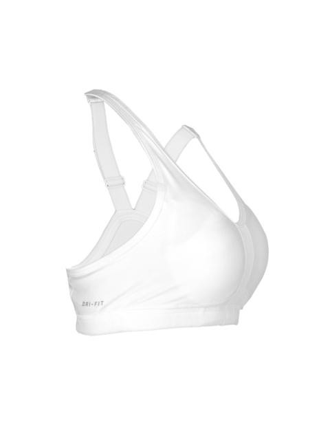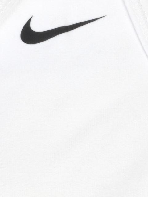 White bra made of Dri-Fit polyester fabric, with mesh panels on the bust bridge and back, adjustable elasticated straps, ribbing along the bust line, and printed nike swoosh logo on left bust