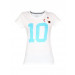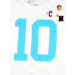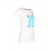 White t-shirt made of 100% cotton, has a round ribbed neckline with an grey fabric tape on the inseam, short sleeves, and graphic print with appliqué on the front