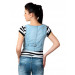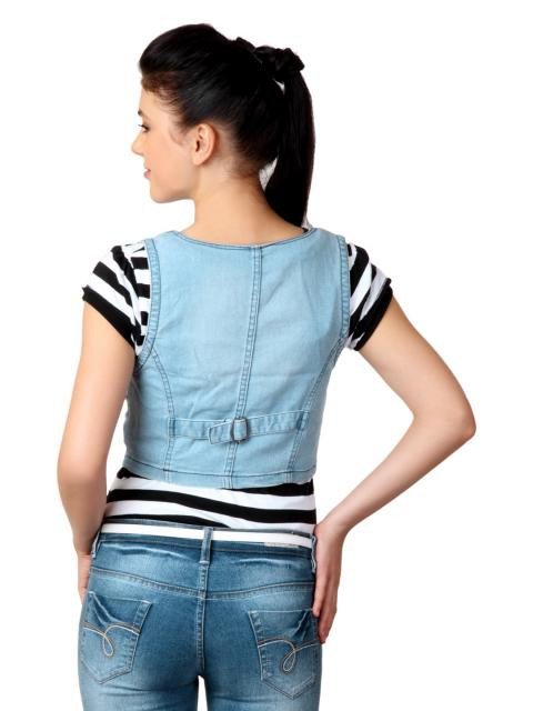 Light blue denim waistcoat with a slight fade, two welt pockets on the front, two buttons on the front and an adjustable belt at the back