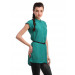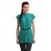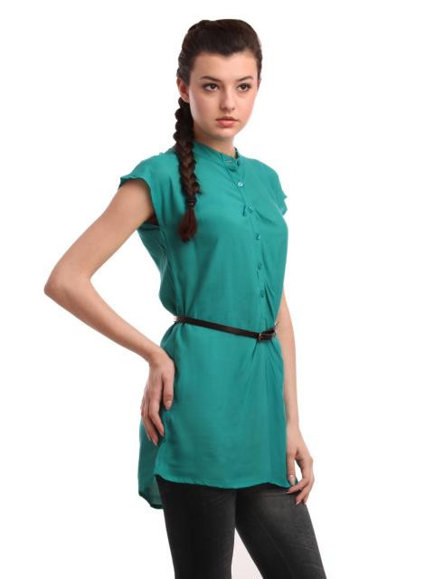 Green top, has a mandarin collar with a top button, half buttoned placket, inverted V pleat below the placket, short sleeves, gathers below the neckline at the back, loops on the waist for a belt and black adjustable belt with a tang clasp