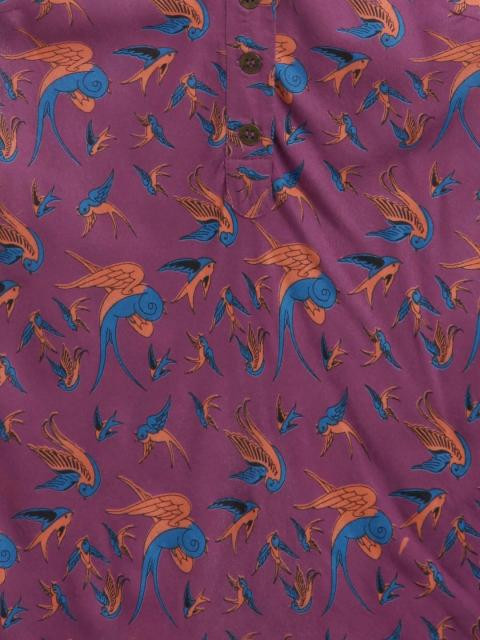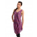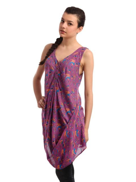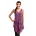 Purple sleeveless long printed top, has a V neckline, half buttoned placket and curved and asymmetric hemline