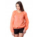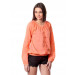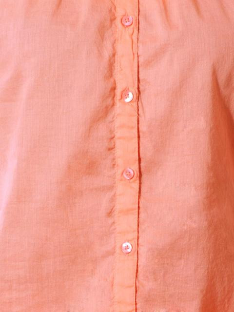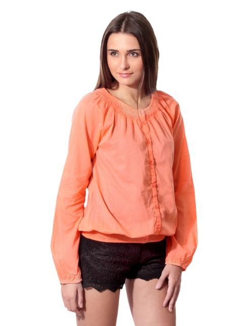 Peach top with round neck with smocking at neckline, full button placket, long raglan sleeves gatheredto elasticated cuffs and body gathered to smocked hem