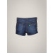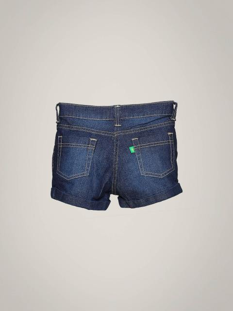 Dark blue denim shorts made of 100% cotton that is mildly stretchable, with fabric lining around waistline, two insert pockets on the front, two patch pockets on the back, light brown thread detailing, foldover hem design, branded button, and studs and palm tree embroidery on the left side near pocket