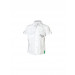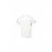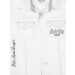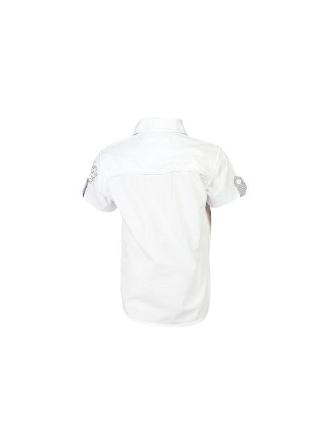 White cargo shirt made of 100% cotton, has a collar with a tape detailing on the inseam, short sleeves with panel detailing beneath the cuffs and buttoned flaps, buttoned placket on the front, two patch pockets on the front with buttoned flaps and stitch detailing, brand name and lettering embroidered on the left pocket, brand name embroidered on the right side, distressed look lettering on the left sleeve and curved hemline