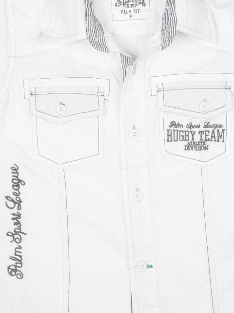 Get your little brat ready for the going-out in this white cargo shirt from palm tree. The embroidered lettering on the side saying "Palm spring league" and rugby team inspired lettering on the pocket and sleeve adds to the sporty vibe, while the cotton fabric keeps him feeling fresh and comfortable all day. Team this with jeans and comfy footwear for a happy, casual outing with his pals.