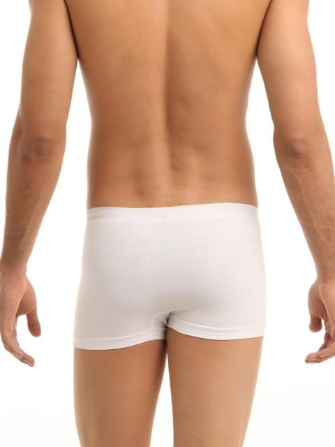 White seamless trunks, elasticized waistband with branding for a smooth and comfortable grip, maximum coverage, tag less abrasion-free comfort, a hint of stretch in fabric provides extra support