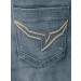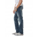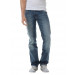 Blue jeans with a washed and creased look, has a button closure with a buttoned fly at the waist, loops at the waistband, two front pockets (has a smaller pocket inside the right pocket), a branded money clip to hold your money securely in the jean pockets, two patch pockets at the back with stitch detail and a synthetic brand patch at the right side of the waistband