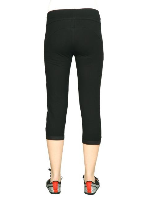 Black capris pants made of 95% cotton and 5% elastane, with flattened seams, broad elasticated waist with reinforced fabric that can be folded, reinforced tear points, tapering hemline with synthetic lining, brand logo embroidered on the left leg