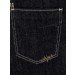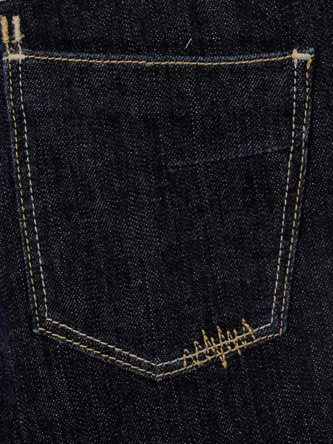 Navy blue jeans, buttoned at the waist with loops and a zipper fly, two insert pockets on the front with red stitch detailing, two patch pockets at the back and a straight Fit
