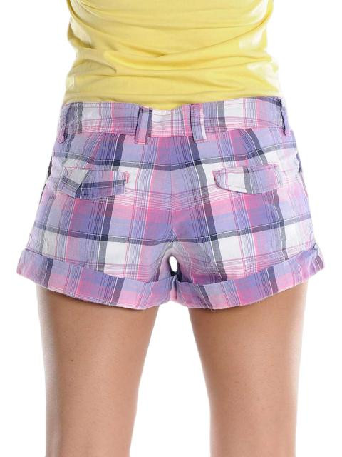 Purple, black, white and pink check shorts, with a buttoned and zippered waist, loops on waist, pocket on the right, mock pocket flaps at the back and foldover hems