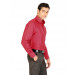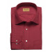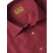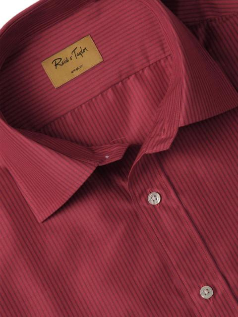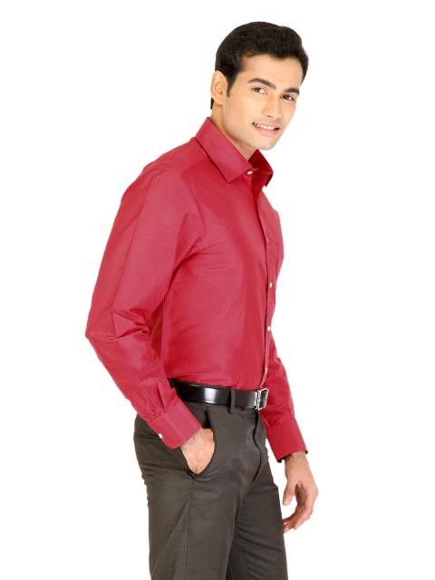 Red formal shirt with navy blue stripes, made of 100% cotton, has full sleeves with buttoned cuffs, tipped collar with buttoned front placket, patch pocket on left chest and a curved hem