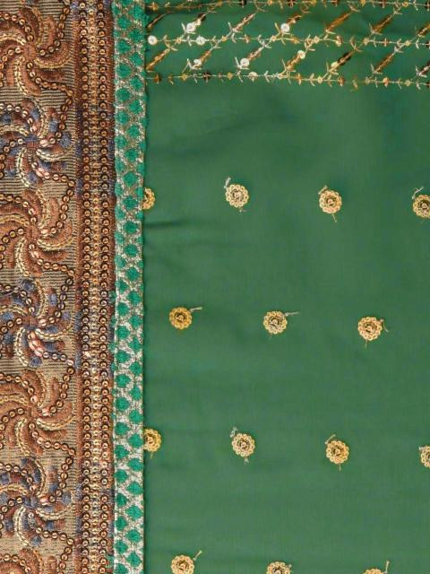 Green sari with intricate gold embroidery work, has a champagne gold border