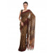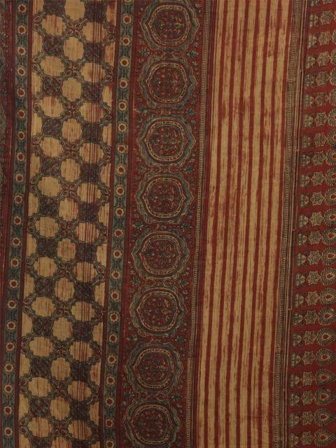 Brown woven, mull printed saree with Ajrakh hand block print and tassels at the edge of the pallu