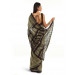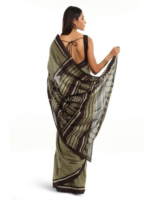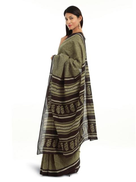 Olive green mull printed sari with a black border