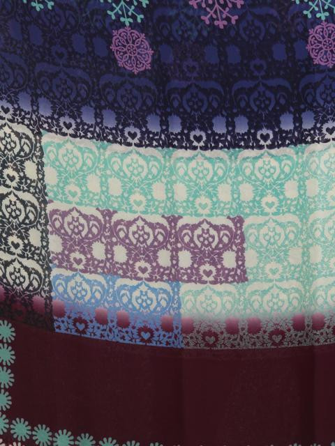 Multi coloured printed flowy sari with blue tones, has a pink tape detailing along the border