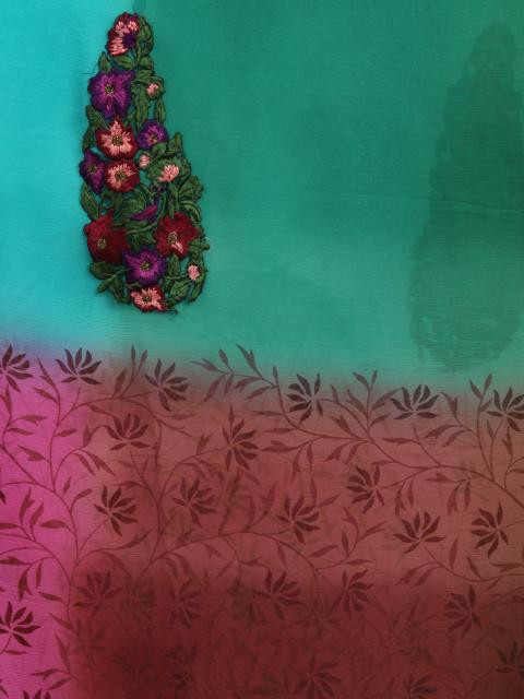 Multicoloured sari with bluish green and magenta overtones, has a metallic coloured border