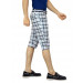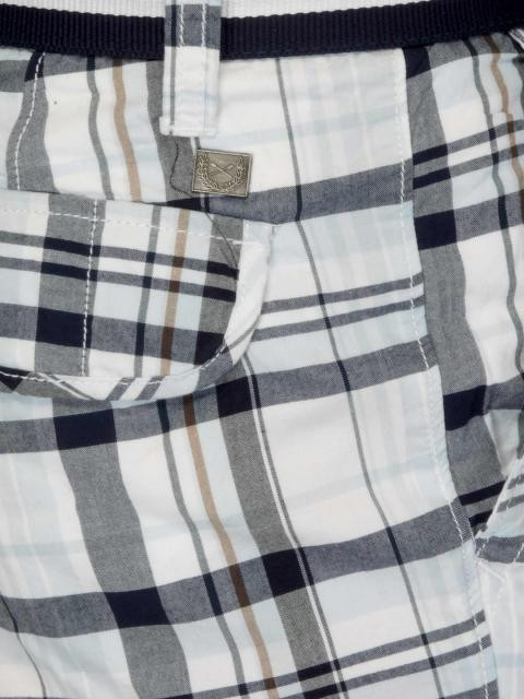 Navy blue and white check shorts made of 100% cotton, has belt loops on the waistband with a zipper fly and button closure, has a fabric belt with a double metal ring closure, two pockets on the sides, two pockets with flaps at the back and stitch detailing