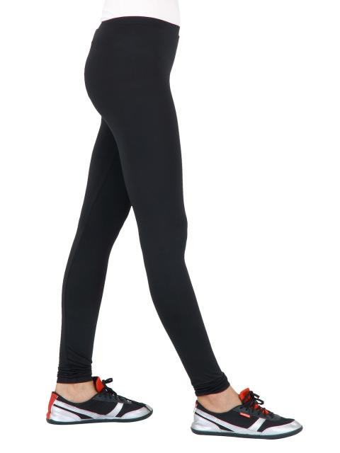 Black slacks made of a polyester-lycra blend, has an elasticated waist and reinforced stitching along the crotch area