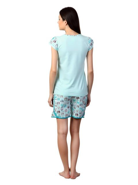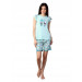 Blue in colour with printed design, round neck, short sleeves with press button cuffs, available pyjama shorts in blue with printed design and adjustable drawcord, also blue pyjama with elasticated waist with draw cord and two pockets on either side