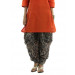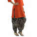 Printed blue harem pants with tones of red and green, has a slim waist band elasticated at the sides, tightly stitched pleats at the front and back that flare out below the hip region, the pants flare at the seat region up to the knee and taper from the knee to the hems onward