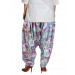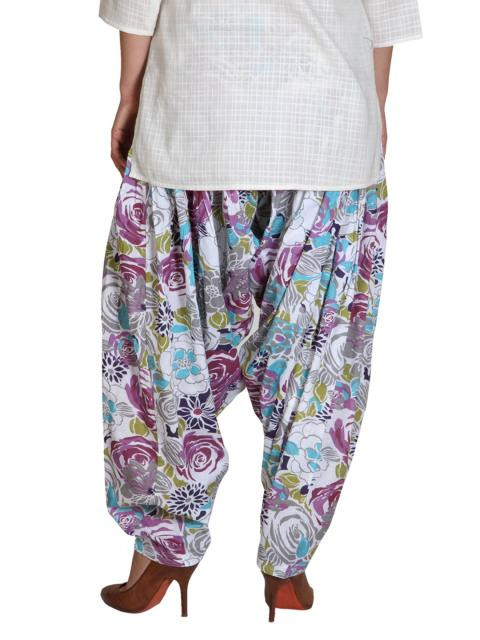 Printed patiala trousers with multi-coloured floral print on white, a broad waistband with a drawstring, tightly stitched pleats at the front and back that flare out below the hip region, the patialas flare at the seat region up to the knee and taper from the knee towards the hem