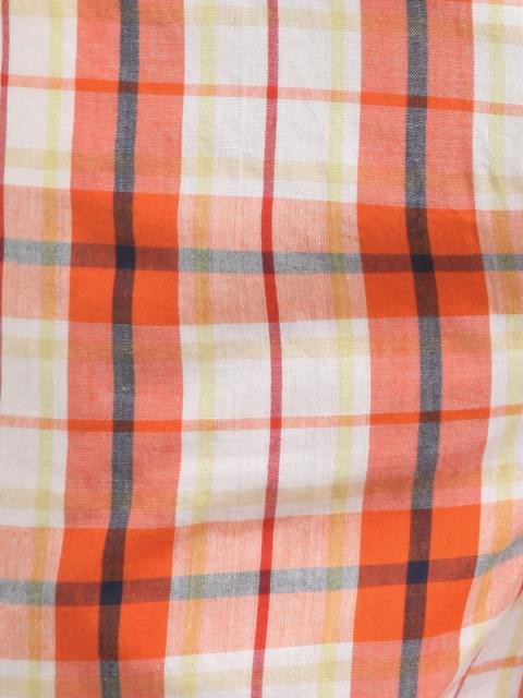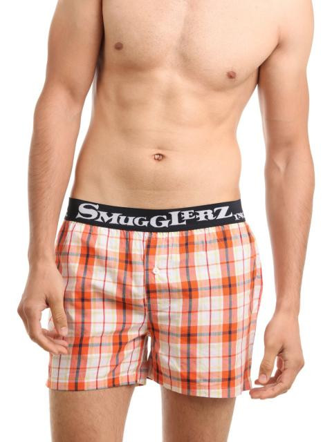 Orange and white check boxers, blue, red and yellow accents, woven, buttoned fly in front, elasticated waistband with branding, elasticated pocket with a cheeky print on the inside, vented hem