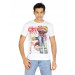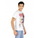 White round neck T-shirt made of 100% cotton, has fabric tape detailing on the inseam of the neckline, short sleeves and screen print on the chest