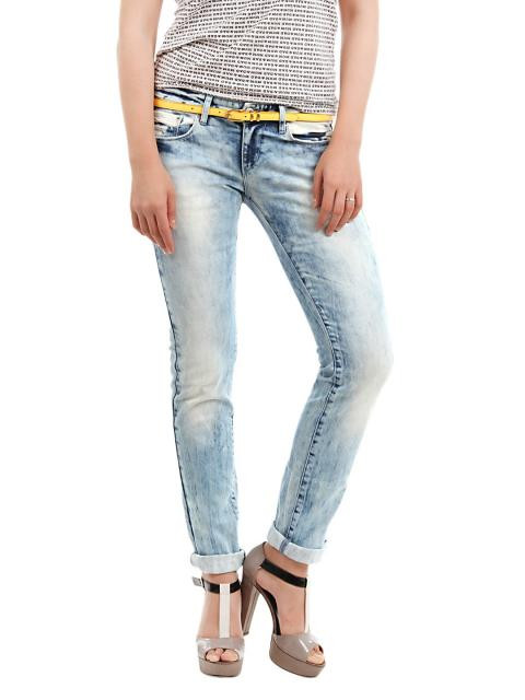 Washed blue stretch jeans, made of 98% cotton and 2% spandex, has two side pockets with one coin pocket, two patch pockets on the back with stitch detailing, zipper fly and button closure, belt loops on the waistband and a brand patch on the waistband at the back