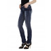 Washed and frayed blue jeans, made of 98% cotton and 2% spandex, has two insert pockets on the front, two patch pockets on the back with graphic print and stitch detailing, brand patch appliqued on the waistband, and a metal zipper and button closure