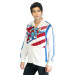 White and blue sweatshirt made of 80% cotton and 20% polyester, has a mock collar, zippered front, full sleeves with panel stripes and ribbed cuffs, a ribbed hem, two front pockets, and graphic print on the front