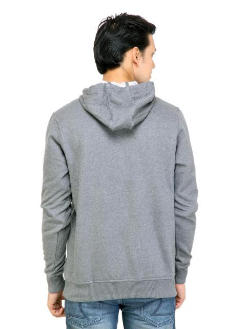 Grey hooded sweatshirt made of 80% cotton and 20% polyester, has a hood with a drawstring, long sleeves, ribbed cuffs and hem, pockets on the front waist and branding in print on the chest