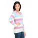 Pink, lavendar, green and cream striped top made of 70% acrylic and 30% wool, has a ribbed V-neck, long raglan sleeves, ribbed cuffs and hem, and embroidered branding on the left hem